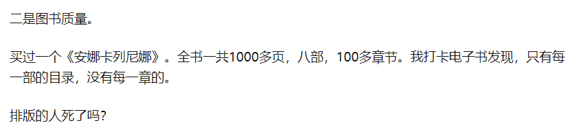 更为离谱的是,你会员服务不好就算了,就连图书质量都不能做到完美适配,在知乎上就有用户吐槽 Kindle 的图书排版,看语气,是相当生气了!