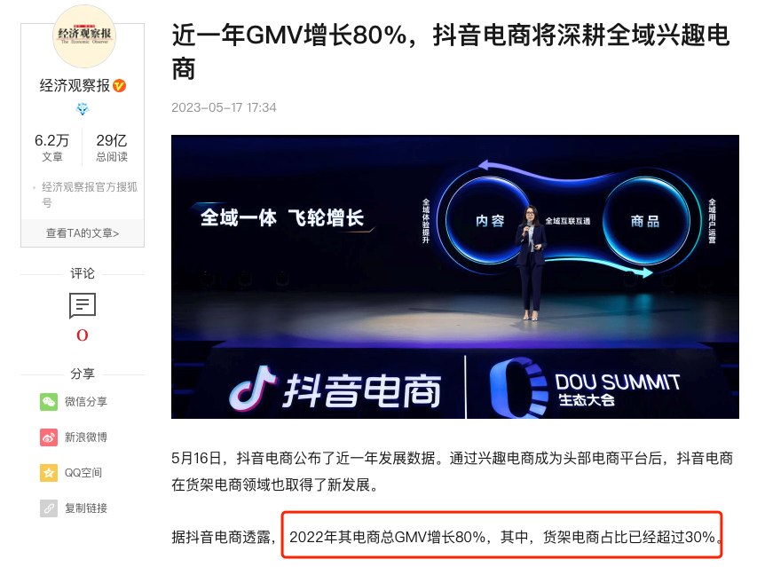 而更让阿里滴血的是,抖音甚至在淘系优势的传统电商上,也撕了一块肉下来。2022 年,抖音传统电商 GMV 达到了 4500 亿,而且还在以 200% 的速度增长。