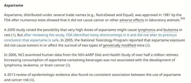 但,这项研究很快就被 FDA ( 美国食品药品监督管理局 )打脸了,说是阿斯巴甜与癌症之间压根儿就没啥关系。