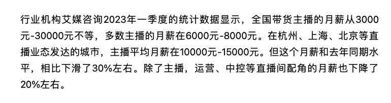 这么说吧,都说直播暴利,但是今年主播工资却缩水得厉害,闻名全国的直播电商之都杭州,一季度主播月薪平均下滑了 30% 。