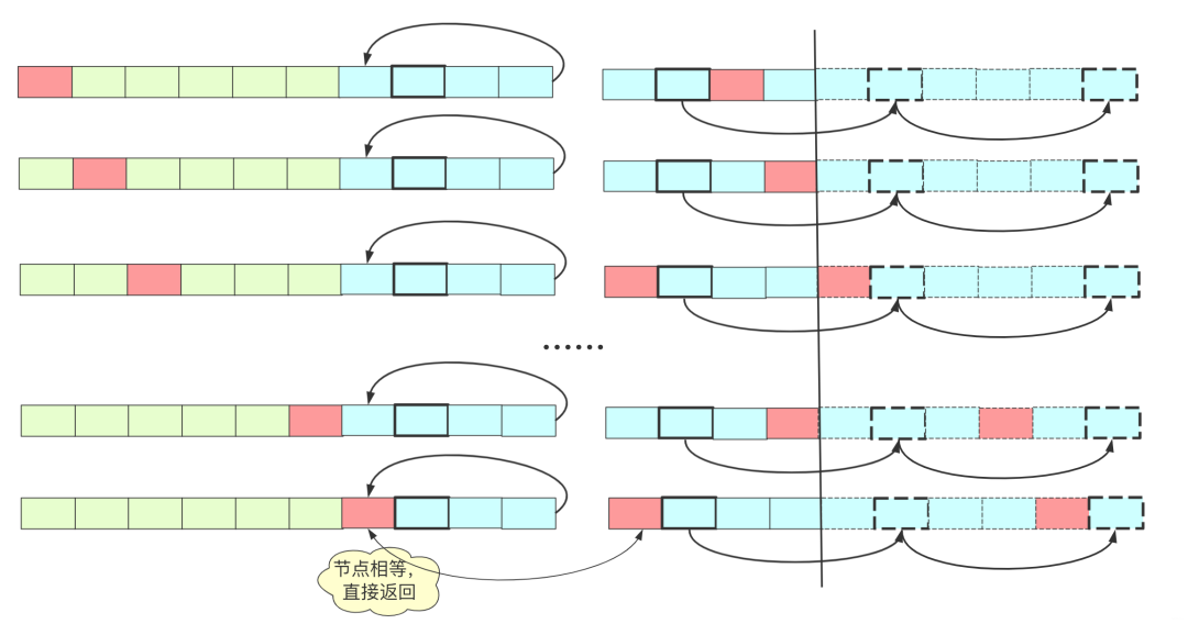 如果某个节点从起点出发,走到fast,slow交汇点走的是x步(n*y步)。此时,如果某个指针从fast,slow交汇点开始如果走环长的整数倍,那么它到时候还会在原位置。