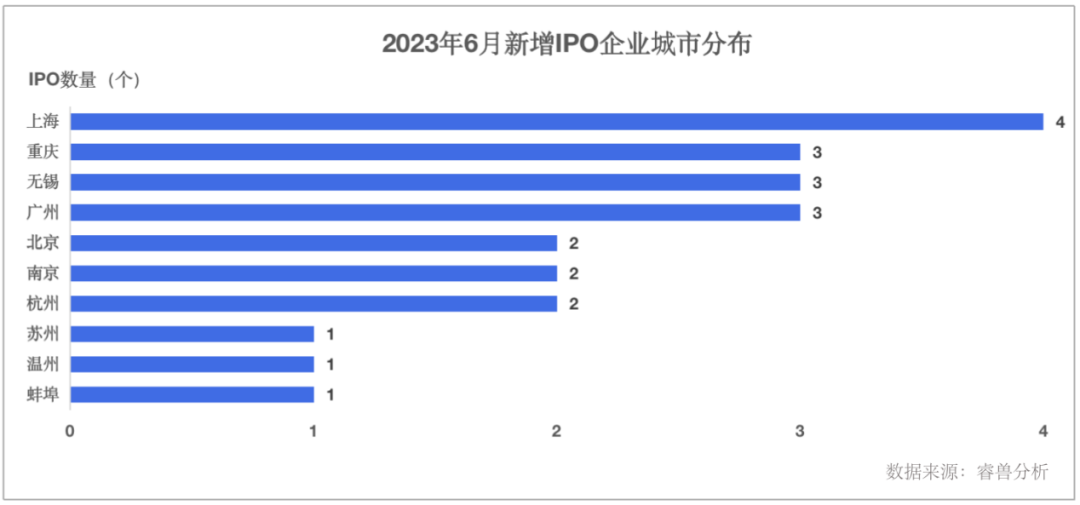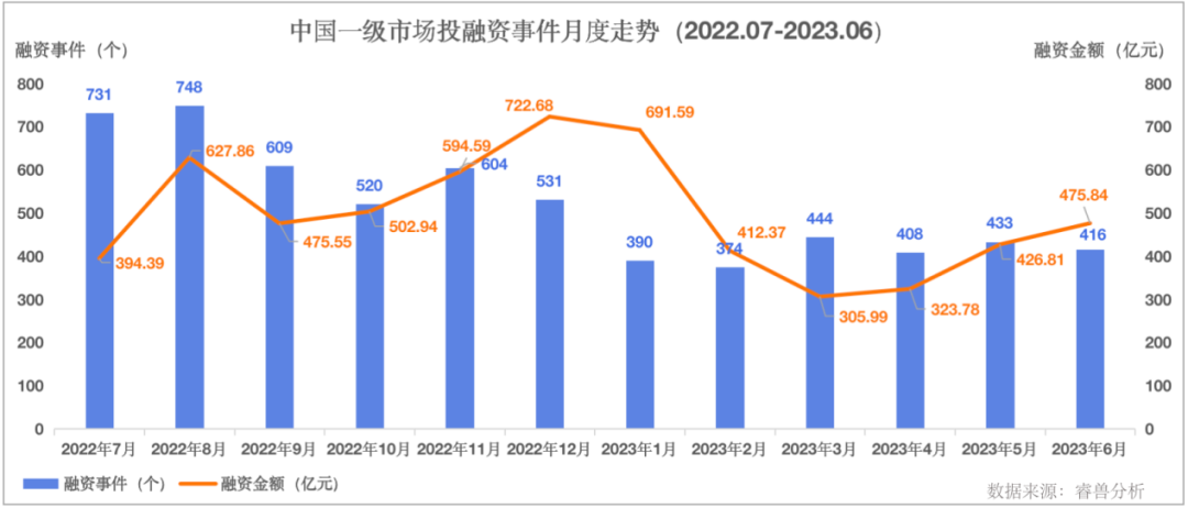 睿兽分析每月整理最值得关注的热门投融资事件,并提供投融资市场分析,帮助大家及时了解最新市场动向。睿兽分析数据显示,2023年6月中国一级市场发生融资事件416个,比上月减少17个,下降4%;比去年同期减少255个,下降38%。已披露融资总额475.84亿元人民币,比上月增加49.03亿元人民币,增长11%;比去年同期增加128.83亿元人民币,下降21%。从融资事件发生的行业来看,排名前五的行业共发生融资事件249个,占所有行业事件总数的60%,前五行业分别是智能制造、人工智能、医疗健康、能源电力、企业服务;前五行业涉及已披露总金额为342.13亿元人民币,占所有行业融资总量的72%。从投融资事件发生所在城市来看,本月排名第一的城市为北京,共发生69个投融资事件;上海则以62个事件位列第二;深圳降至第三名,发生49个投融资事件。2023年6月,全球新增8家独角兽企业,其中中国新增3家。今年全球累计新增45家独角兽企业,其中中国累计新增17家,占比38%。全球当前总计有1844家独角兽企业,其中中国当前总计有541家,占比29%。茶百道创立于2008年,是四川成都的本土茶饮连锁品牌,官网显示,旗下加盟店数量6000+,品牌已覆盖中国各大城市。茶百道专注将不同天然食材与中国茶进行搭配,表达和呈现新式茶饮不同风味。公开资料显示,茶百道2022年实现营收约40亿元,利润约9亿元。茶百道于2023年6月完成10亿元新一轮融资,估值接近180亿元,跻身独角兽行列,领投方为兰馨亚洲,跟投方为正心谷、草根知本、中金资本、番茄资本,均为国内知名机构。茶百道此轮融资将用于智能生产加工基地和供应链基地等上游建设,以及数智化系统的搭建完善。2.多模态AI大模型领域研发商 「MiniMax」人工智能技术公司MiniMax由李开复、李飞飞等知名人士于2018年创立,总部位于北京,主营业务为人工智能技术研发、智能硬件产品的设计与销售。MiniMax团队致力于用领先的通用人工智能引擎技术,通过多场景和多维度应用及交互,以用户反馈量级的提升和多模态AI技术一体化的应用实践,推动通用人工智能技术新范式变革。MiniMax 6月完成新一轮融资,融资金额超过2.5亿美元,估值达到近12亿美元,成为新晋独角兽企业。3.人工智能初创公司 「Inflection AI」Inflection AI成立于2022年,总部位于美国旧金山,以其类ChatGPT平台而受到广泛关注,该平台利用大型模型构建对话系统,为用户提供智能问答和对话服务。Inflection AI近期推出智能对话聊天机器人Pi,不仅满足搜索和回答问题等生产力需求,更旨在根据个人兴趣和需求,以自然、流畅的方式提供文本和语音对话、友好的建议以及简洁的信息。Inflection AI于6月完成13亿美元最新一轮融资,估值达到40亿美元,成功跻身独角兽企业行列。本轮投资方包括微软、英伟达及科技大佬比尔·盖茨、领英联合创始人雷德·霍夫曼和谷歌前CEO埃里克·施密特。睿兽分析数据显示,2023年6月在全球交易所完成IPO上市的中国企业共计43家,数量比上月增长19%,比去年同期增长10%;募资金额总计422.13亿元人民币,金额比上月减少5%,比去年同期增加12%。其中登陆A股39家、港股4家。行业分布上,智能制造以新增14家IPO企业数量成为最热IPO赛道。地区分布上,江苏排名第一,当月新增9家IPO企业。本月新增IPO企业中,有VC/PE支持的36家,VC/PE渗透率84%,涉及融资总额为164.61亿元人民币;有CVC支持的14家,CVC渗透率33%,涉及融资总额为48.84亿元人民币。从城市分布来看,新增IPO企业所在热门前五城市为上海、重庆、无锡、广州、北京。1.【A股】光伏产品和能源解决方案提供商「阿特斯」于6月9日登陆上交所科创板,股票代码为688472.SH,首次公开发行价11.10元/股,发行数量为5.41亿股,募资净额57.28亿元,上市市值为400.38亿元人民币。阿特斯成立于2009年7月,总部位于苏州高新区,主营太阳能组件、大型储能和户用储能产品,并提供大型储能和光伏解决方案的系统集成服务,其母公司为阿特斯太阳能公司,早在2006年11月于美国纳斯达克上市。阿特斯上市募集资金将主要用于研发、扩充光伏组件产能和建设研究院,以实现现有产品持续迭代优化和开展新型光伏电池产品研发试制。2.【A股】MEMS传感器研发生产商「芯动联科」于6月30日登陆上交所科创板,股票代码为688582.SH,首次公开发行价26.74元/股,发行数量为5521万股,募资净额13.54亿元,上市市值为106.96亿元人民币。芯动联科成立于2012年7月,总部位于安徽蚌埠,是一家集高性能MEMS惯性传感器研发、测试、销售为一体的高新技术企业,主要产品包括MEMS陀螺仪和MEMS加速器。芯动联科上市募集资金将主要用于高性能及工业级MEMS陀螺仪、MEMS加速度计、高精度MEMS压力传感器开发及产业化项目、MEMS器件封装测试基地建设项目等。3.【港股】医药电商「药师帮」于6月28日登陆港交所主板,股票代码为09885.HK,首次公开发行价20港元/股,发行数量1580万港股,募资总额2.15亿港元,上市市值为126.47亿港元。在“互联网+”热门创业风口背景下,药师帮2015年开始经营基于移动互联网的药品供应商和基层医疗终端交易的线上撮合平台,致力于通过互联网提升传统医药流通效率。2019年,药师帮在原有平台业务基础上增加自营业务,实现三年(2019-2022)营收快速增长,但截至2022年底,公司整体仍处于亏损状态。以上内容摘自睿兽分析《2023年6月投融资报告》,更多详细内容及数据分析,请扫描下方二维码获取完整版报告