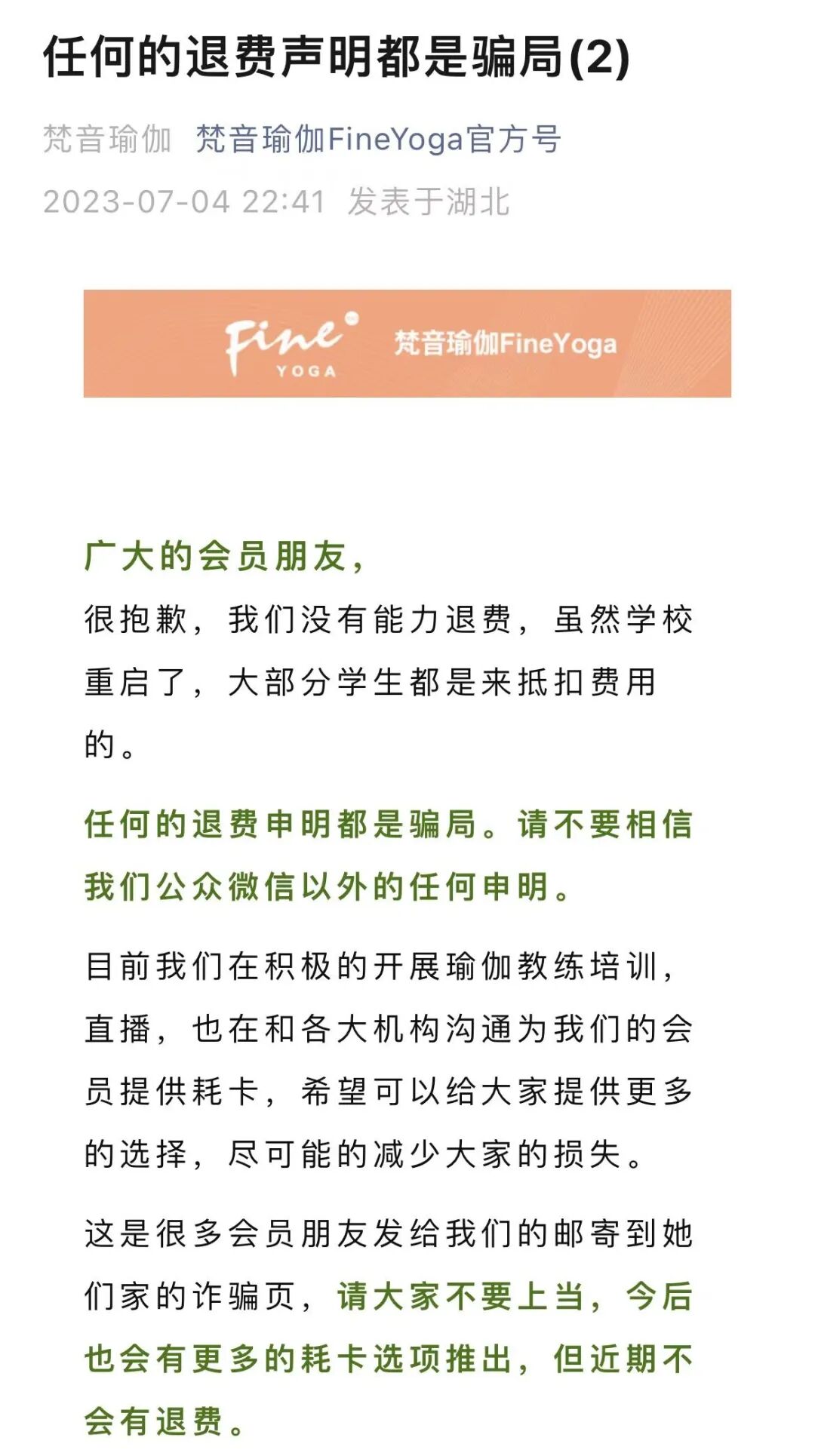 【梵音瑜伽回应假退费声明】梵音瑜伽7月4日晚间于官微发布声明称,任何的退费声明都是骗局,“我们没有能力退费,虽然学校重启了,大部分学生都是来抵扣费用的”。声明称,目前该机构在积极地开展瑜伽教练培训、直播,也在和各大机构沟通为其会员提供耗卡。今后也会有更多的耗卡选项推出,但近期不会有退费。此前,据媒体报道,梵音瑜伽被曝拖欠员工工资,不少门店闭馆停业,消费者退费困难。对此,梵音瑜伽创始人曾发文宣布停业整顿,并表示会通过不同方式偿还欠债。(财经网科技)