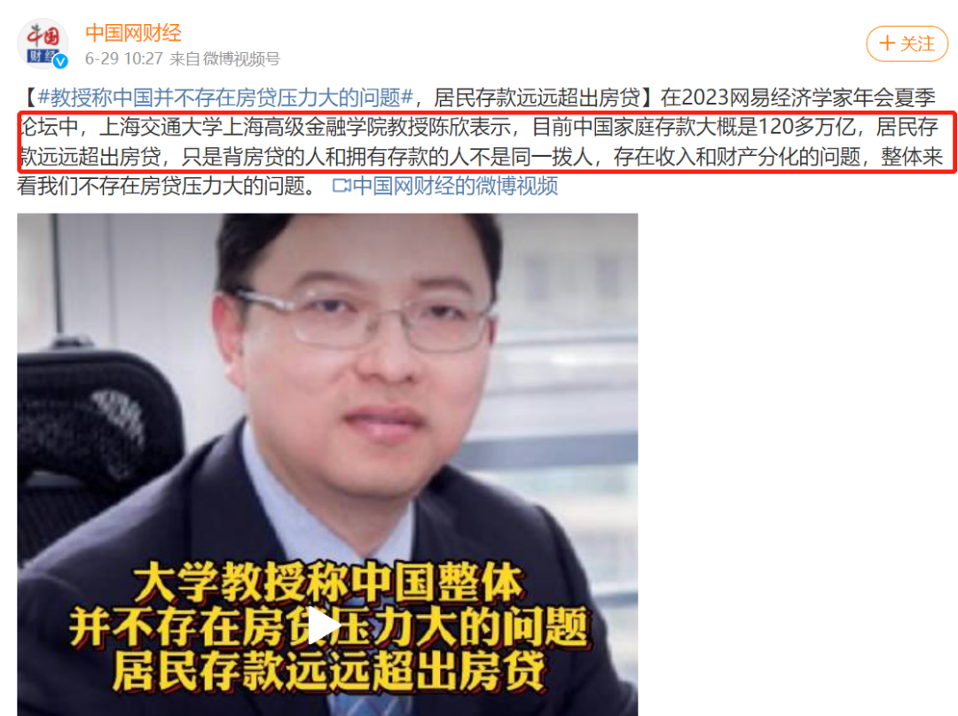 近日,有媒体报道,上海交通大学教授陈欣称“整体来看中国不存在房贷压力大的问题,居民存款远远超出房贷”,这一言论引发争议。![]()