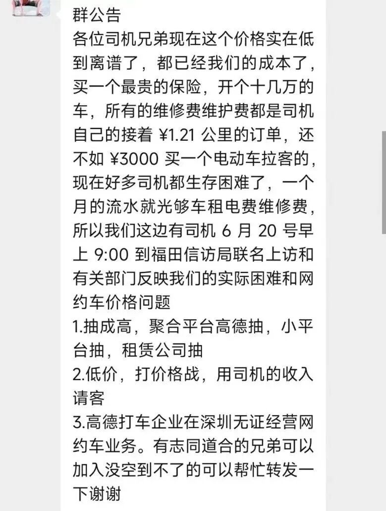 在深圳的司机群里,一些司机说:“高德打车为了市场份额运价一降再降……其恶意倾斜行为极度拉低网约车整体运价”。“现在这个价格,实在低到离谱了,都已经到我们的成本了,买一个最贵的保险,开个十几万的车,所有的维修费维护费都是自己的,接着1.21元/公里的订单,还不如3000元买一个电动车拉客。现在好多司机都生存困难了,一个月的流水就光够车租电费维修费。”![]()