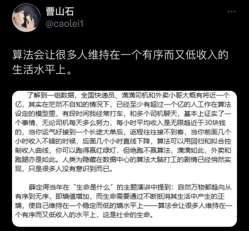 有不少司机说,为了降低成本,空车等客的时候,都不敢开空调。说真的,看到司机们的这些抱怨,感到焦虑的恐怕不仅仅是司机们吧。要知道,还有不少人想进入网约车行业以解燃眉之急呢,他们作何感想?现在送外卖是基本饱和了,网约车又内卷成这样,真令人意想不到。有媒体分析,高德打车之前用补贴扩大用户,低价引流,发展很快,实现了盈利,并成为行业老二。那时候网约车司机也是受益者,例如高德打车会有一些“免抽佣金”的活动。但随着形势变化,高德打车不仅不补贴了,而且开始靠压低司机收入来保持低价的吸引力,这对于乘客当然是好事,但司机群体受不了。实际上这个问题是平台经济共同的问题。平台为了竞争,不得不尽力满足消费者的愿望,但因此就会引起从业者的不满。比如外卖平台,也面临这个问题。平台为了满足消费者对送餐时间的要求,只能用各种方式给外卖员施压,外卖员当然不满。而消费者又会和外卖员站到一起,指责平台不体恤外卖员,全然忘了他们在外卖员送餐稍迟时,会毫不犹豫地打下差评。这就是现实,一个平台要顺利发展,只能面对现实,尽量在从业者利益和消费者利益之间找到一个平衡。![]()