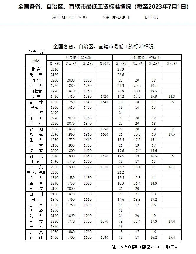 据第一财经,人社部最新发布了全国各省、自治区、直辖市最低工资标准情况(截至2023年7月1日)。其中,上海以2690元仍居榜首。目前全国共有15个省份第一档月最低工资标准在2000元及以上。