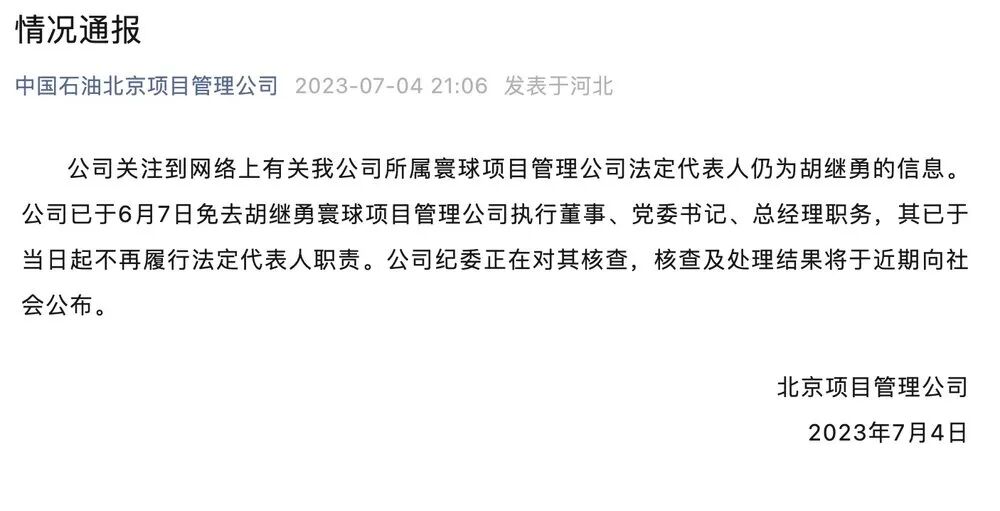 据界面,7月4日,中国石油北京项目管理公司发布通报,公司关注到网络上有关我公司所属寰球项目管理公司法定代表人仍为胡继勇的信息。公司已于6月7日免去胡继勇寰球项目管理公司执行董事、党委书记、总经理职务,其已于当日起不再履行法定代表人职责。公司纪委正在对其核查,核查及处理结果将于近期向社会公布。