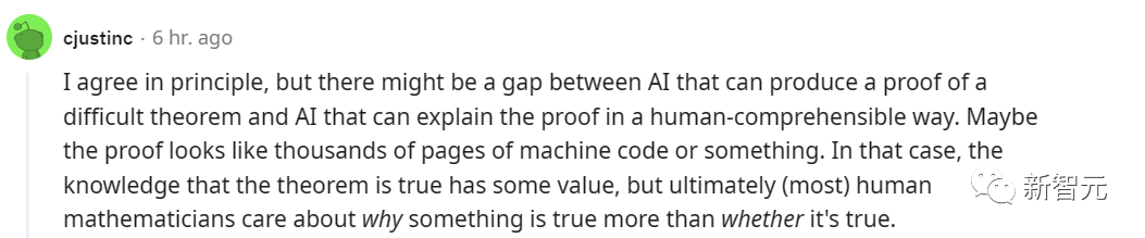 另一方面,很多深度接触过AI技术的数学家也对AI在数学研究中不被重视提出了担心。他们认为,人工智能技术经常能够「直接地」帮助数学家们「找到」自己想要的答案。虽然数学家或者AI专家们都搞不清楚AI是如何找到这个答案的。与DeepMind合作过的数学家Geordie Williamson曾经分享了一段与DeepMind合作的经历。他在和DeepMind合作的过程中,DeepMind发现的一个神经网络可以预测他认为很重要的数据值,而且异常准确。他就很努力地去试图理解AI是如何做到的,因为这可能成为一个定理的基础。但他最后还是没办法搞懂AI的逻辑,而且DeepMind的人也没法做到。就像欧几里得一样,神经网络以某种方式找到了真理,但是逻辑原因却很难被理解。另一方面,从这位数学家的角度看来,推理是数学的精髓,但却是机器学习中一直缺少的一块拼图。在科技圈中,如果有一个黑箱在大部分情况下都能提供解决问题的方法,科技圈就会非常满足了。这位数学家看来,尝试理解神经网络的原理会引发出令人着迷的数学问题。而解决这些问题,会让数学家「为世界做出有意义的贡献」。如果AI生成的假设定理充斥整个世界,我们该怎么做?网友对此发出灵魂拷问,我对AI系统提出新的假设/公式是第一步有所怀疑,因为DeepMind早已在纽结理论中做到了。我想知道,社区将如何应对AI输出的大量新假设。check人工智能创建的逻辑论点是一回事;被数百万个「哦,这可能是真的」建议淹没是另一回事。我不认为我们现有的评论和出版系统为此做好了准备。有人认为,机器并不能很快就能完成数学研究,但可以看到它改变了研究方式,就像机器学习模型和计算能力如何改变了生物学领域一样。还有网友表示,从AlphaDev开始,我就一直在思考这个问题,但是同样的程序可以构建排序算法,也可以使用自动证明检查器来证明数学定理。真正的问题是它是否可以用来证明一些重要的东西,而不仅仅是微不足道的发现。不过还是有网友依然对GPT类的工具能否真的发现有价值的真理持怀疑态度。也有网友指出,可能人类和AI对于数学理解和关注本就有区别,AI证明了什么是真的,而人类总是关注为什么它是真的。https://www.nytimes.com/2023/07/02/science/ai-mathematics-machine-learning.html