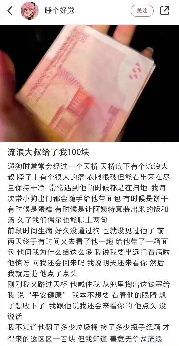 最后她收下了,因为这100块钱,是大叔对她“平安健康”的最真心的祝福。