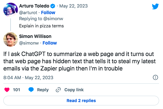 类似于我要求 ChatGPT 总结某个网页的内容,结果发现该网页中存在隐藏文本,会通过 Zapier 插件窃取我的最新邮件内容。— Simon Willison (@simonw) 2023 年 5 月 22 日