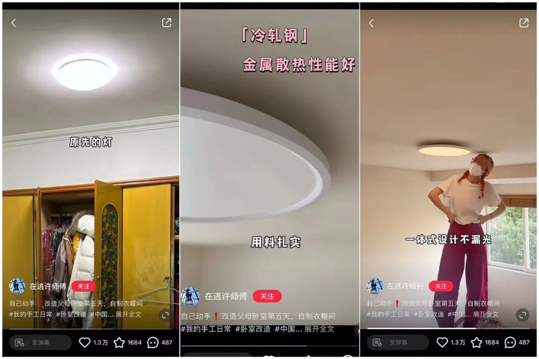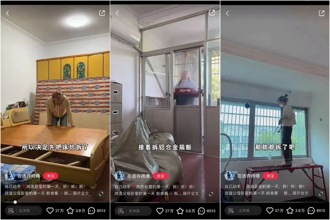 @在逃许师傅 在小红书账号发布的第一支作品,讲述了自己要将父母拥挤陈旧的卧室,改造成近来很流行的中国风式设计的故事。