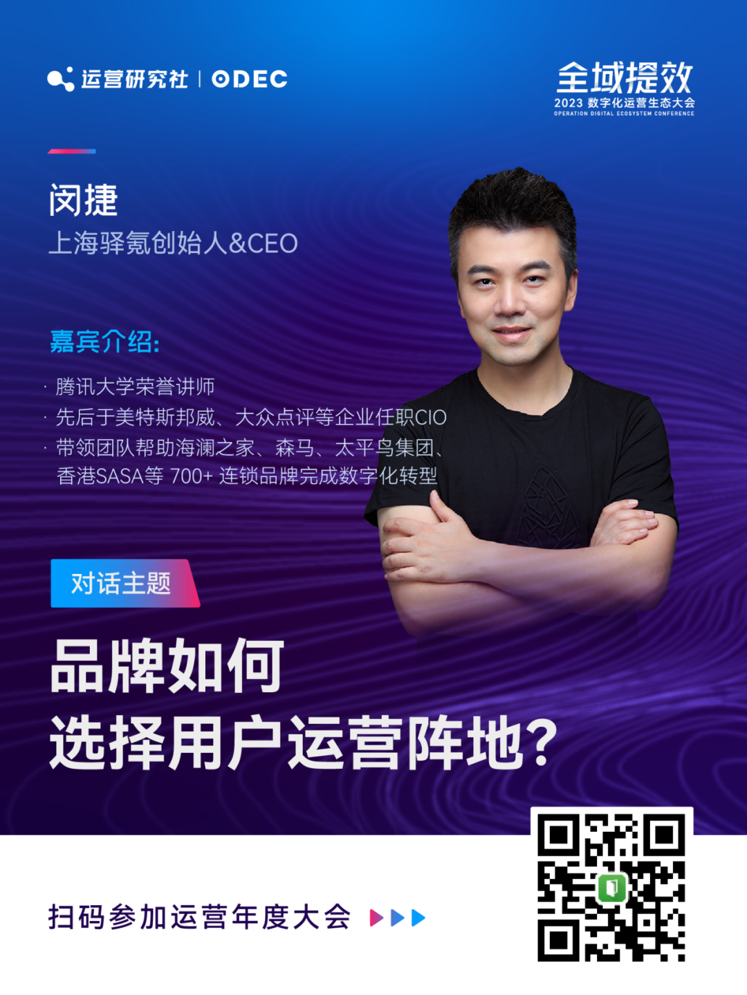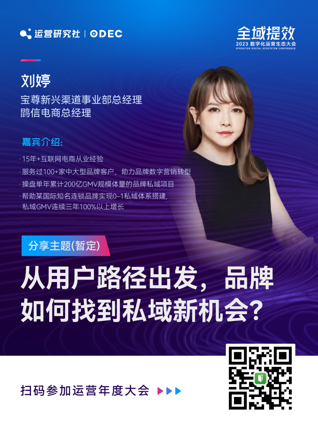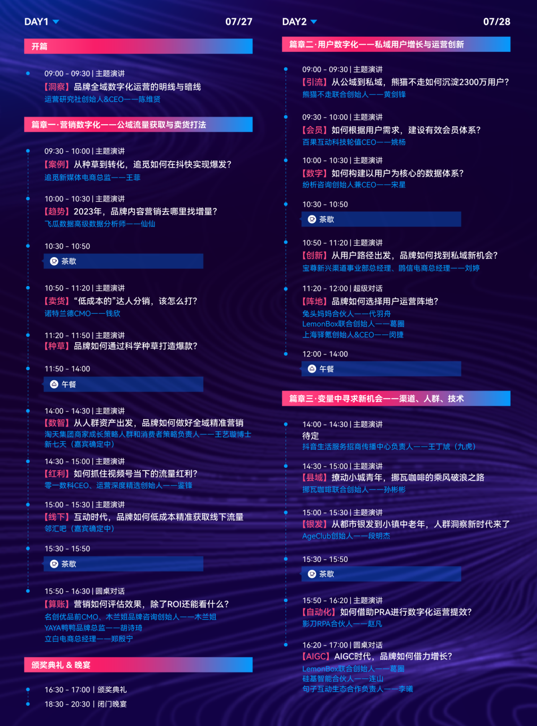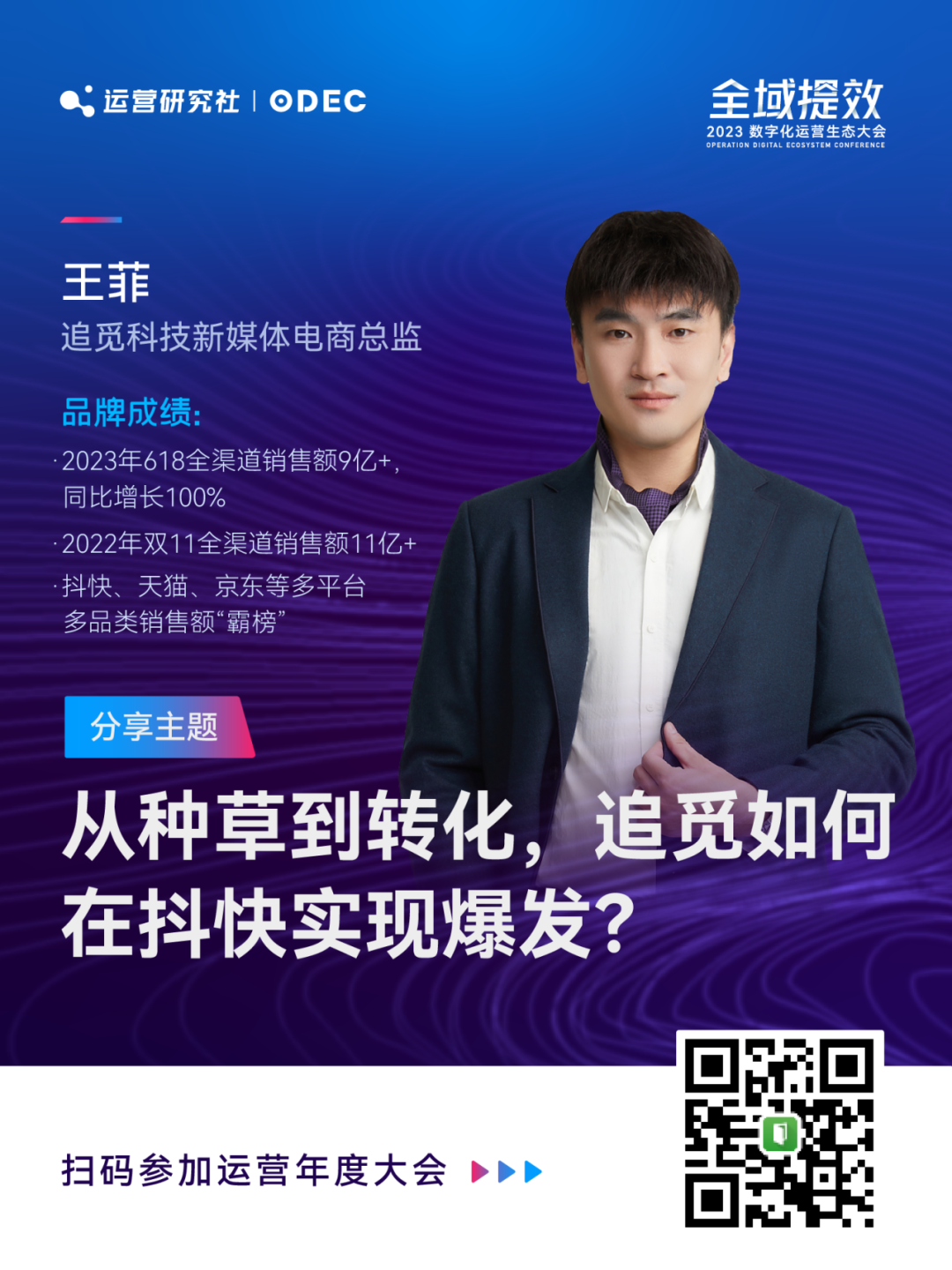 在本次大会我将结合品牌和零售商家案例,详解全域数字化运营的实践框架。同时我们策划了三个主题篇章,邀请 25 位品牌操盘手和运营实战专家现场分享!帮助品牌商家了解全域数字化运营新趋势、新打法、新案例。