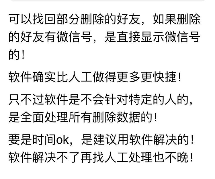 尽管小编反复表明,使用软件是更泛化的针对一切已删除联系人去处理,而联系人工处理是更快更有效的针对特定的好友去处理。然而,这少数的几个客户似乎没有懂得小编所说的意思,以为下载了APP就一定能解决他所需要解决的问题。