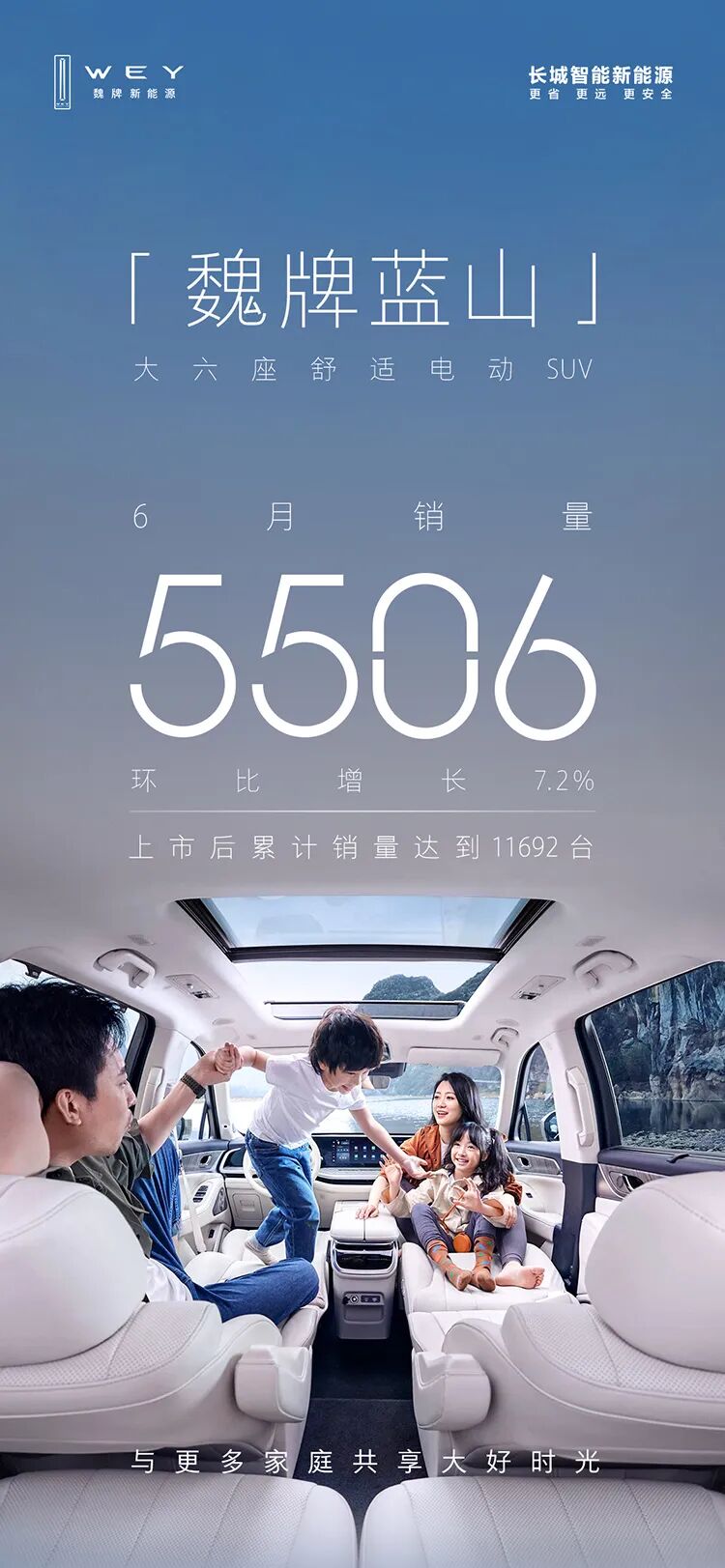 数据显示,6月魏牌销量达到6602台,环比增长14.4%。其中,蓝山销量5506台,环比增长7.2%,加上5月销量5136台,在没有保留缓冲期的情况下,上市至今累计销量已达11692台,真正成为30万元级家庭大六座SUV的市场标杆,且再次荣登30万级插混SUV细分市场销量首位。
