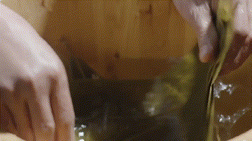 采摘新鲜粽叶,来自植物本身的香味;挑选表面光滑软韧的做粽叶;洗净后,用盐水泡上一个小时,既能杀菌、又柔软;包出来的三角粽子棱角分明,清香袭人。