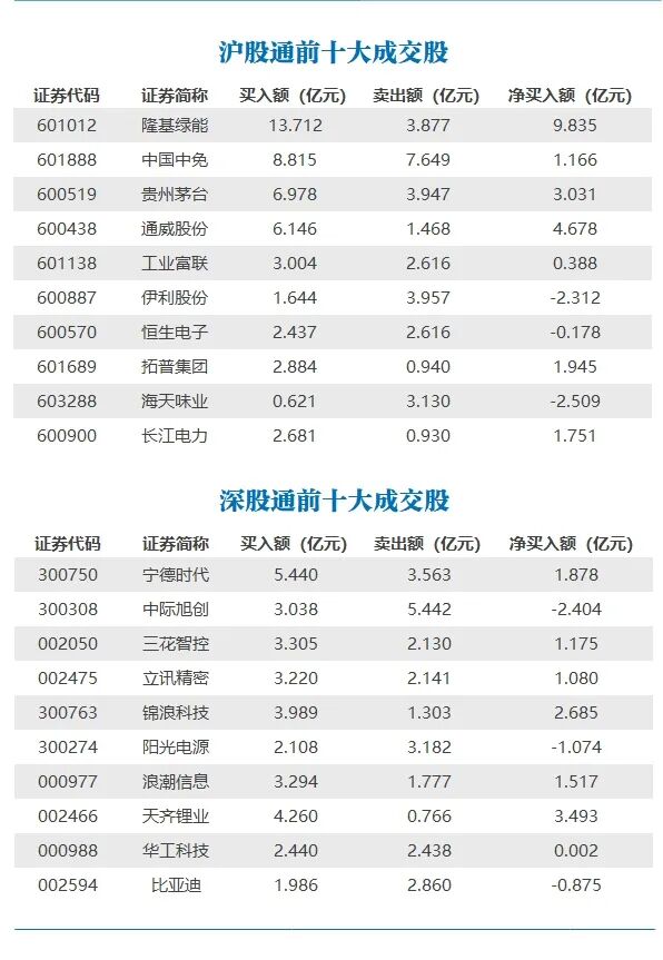 7月10日,北向资金全天净买入12.3亿元,终结连续4日净卖出态势;其中沪股通净买入12.67亿元,深股通净卖出0.36亿元。前十大成交股中,净买入额居前三的是隆基绿能、通威股份、天齐锂业;净卖出额居前三的是海天味业、中际旭创、伊利股份。