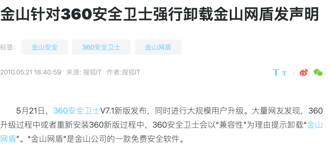 这就动了传统杀毒厂商的奶酪,包括金山。金山官方BBS也发布了一份关于“360安全浏览器屏蔽金山网盾”的公告