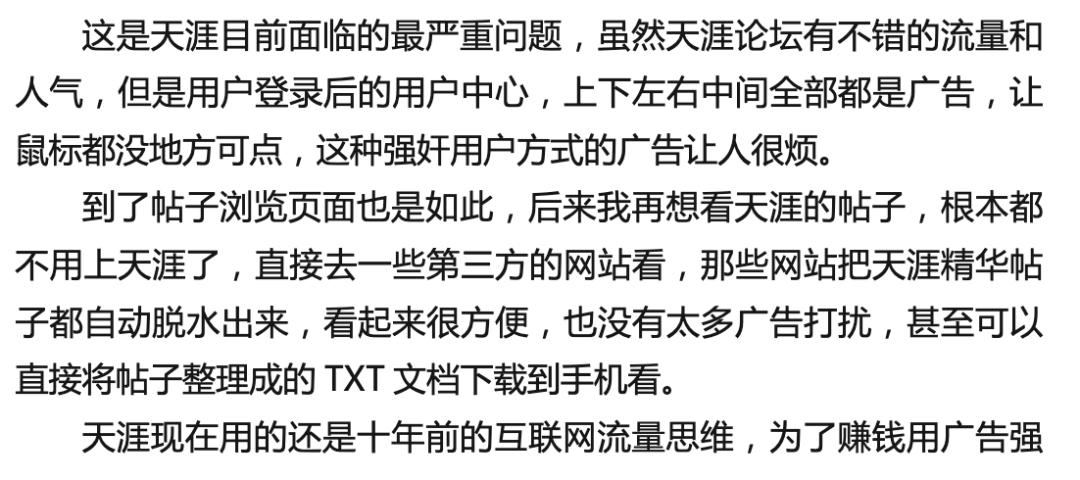 广告收入严重依赖于流量,天涯为了获得广告营收,大幅在社区内植入广告位,影响了用户体验,很有竭泽而渔的感觉。