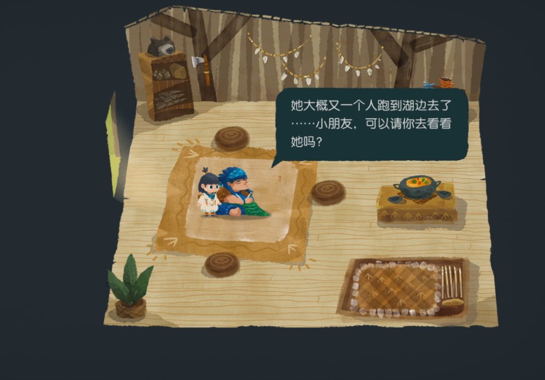 举个例子吧:我们在小岛上的第一个任务是寻找去湖边散心的女孩,她妈妈告诉我们女孩一个人跑去湖边了。