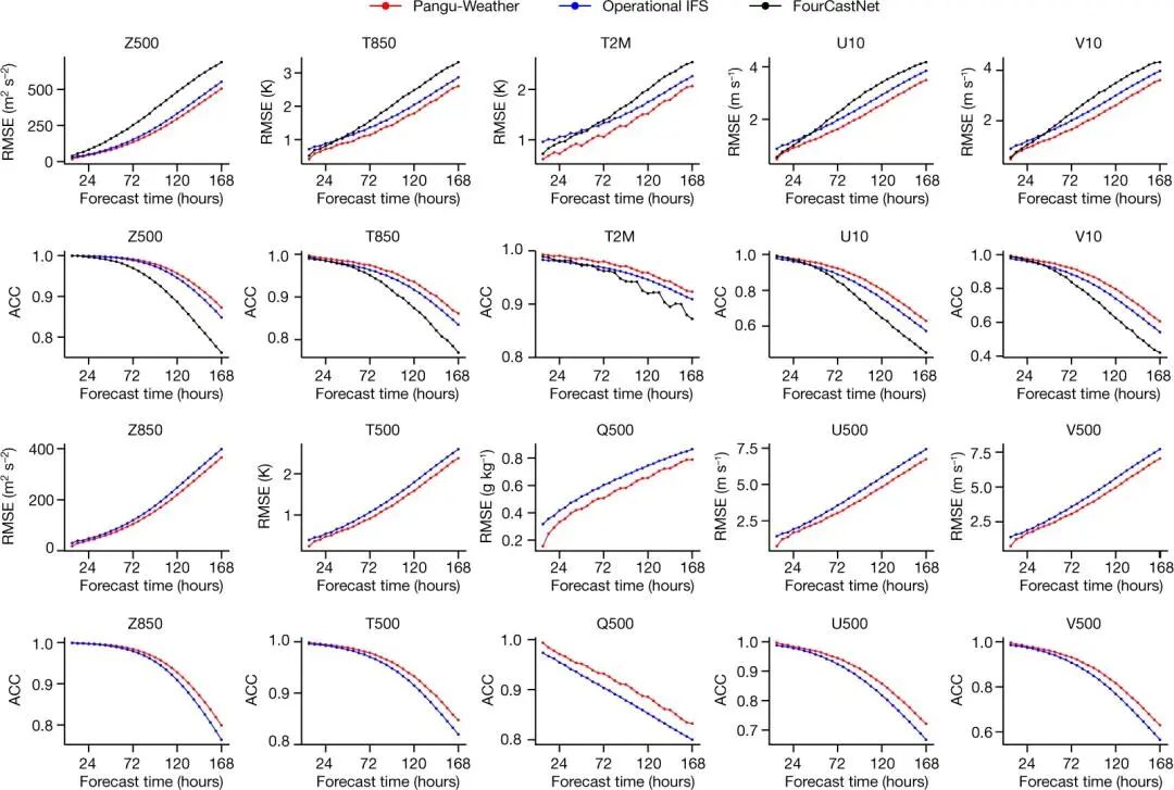 最主要的是,它的预测精度甚至超过了号称全球最强的欧洲气象中心的 IFS 系统,算是头一个 AI 预测赢了传统数值预测的产品。