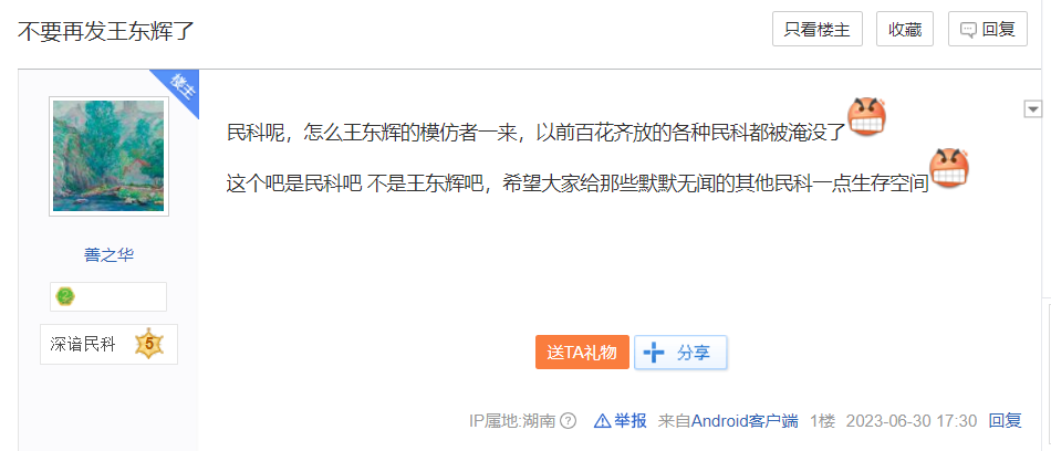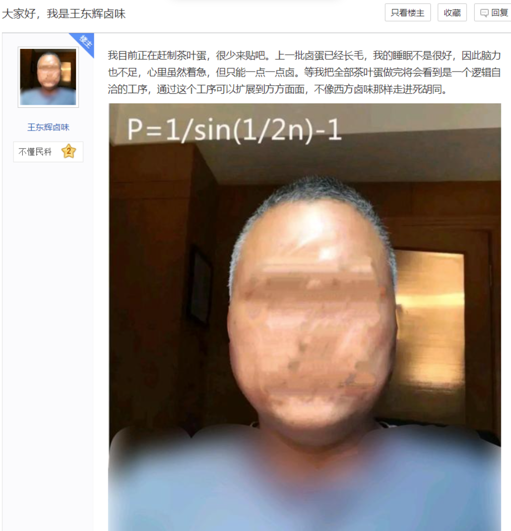 他的走红甚至倒逼吧友专门发帖,呼吁说这是民科吧,不是王东辉吧,给其他民科一点生存空间。