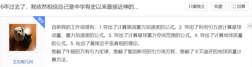 经过一番探查后,我发现王东辉混迹于民科吧近 10 年,没啥爆炸理论,直到前段时间,他频繁发布嚣张言论,拳打牛顿,脚踢爱因斯坦,顺带推倒科学巨匠卡文迪许。