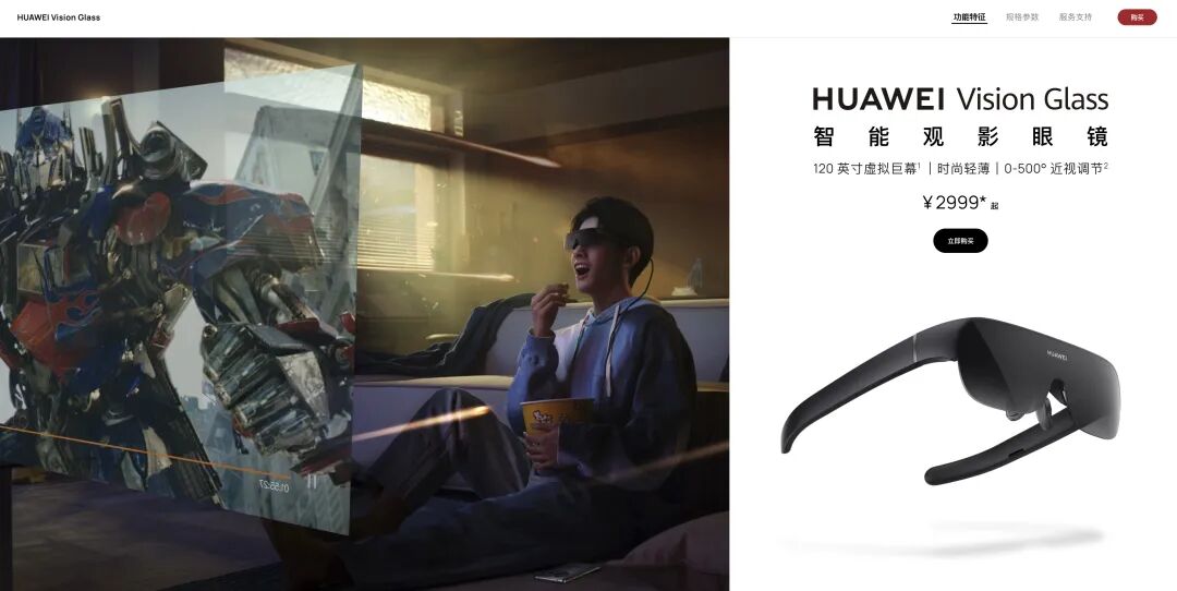 比如 Vision Glass 明明是个 AR 眼镜,但宣传页面当中却没有出现过一次 “AR” 这个词,华为对它的介绍是:这就是一个拥有 120 英寸虚拟巨幕的智能观影眼镜。