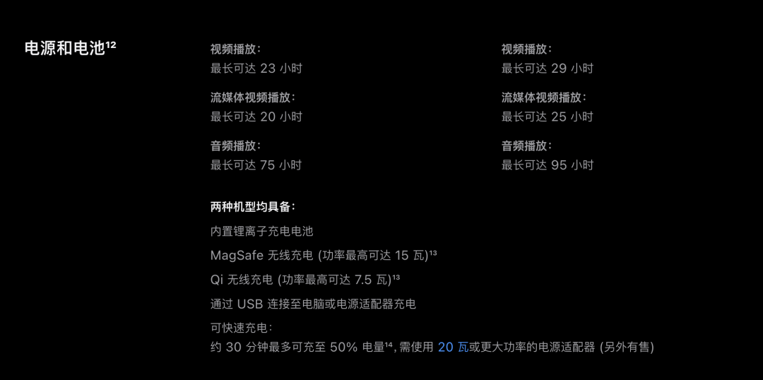 而苹果则不会透露手机电池的具体规格,他们只会跟你说 “ 我们的新 iPhone 续航比前代提升了多少小时,可以播放多少小时的视频或者音频。 ”