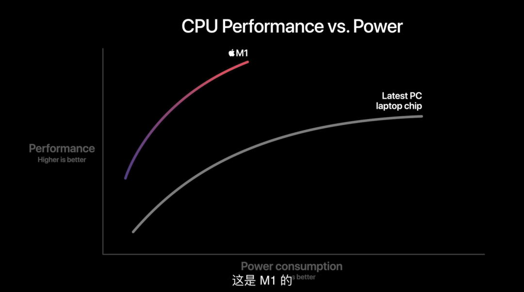比如之前介绍 M1 MacBook 时,苹果就提到说 M1 芯片的能效比主流 PC 笔记本的处理器提升了百分之多少,所以说果子哥不是不跟其他家比,而是只在自己有巨大优势的时候跟其他家比。