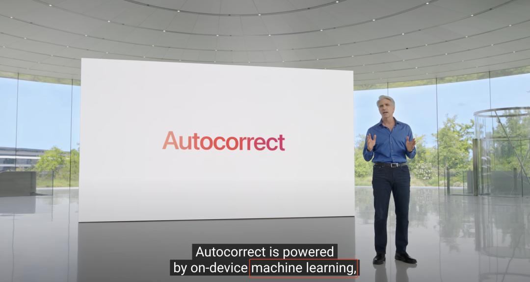 再比如 “AI”,苹果在 iOS 17 上,给键盘内置了全新的语言模型,可以自动纠正拼写错误的词,这明显是跟 AI 有关的,但苹果却用了 “ 机器学习 ” 这个词来代替 “ AI ” 。
