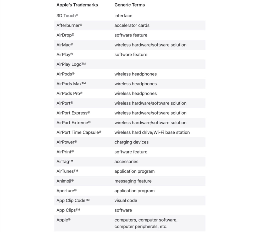 比如在苹果官网上有一个清单,这上面有各种东西的商标和对应的话术,包括了软件、硬件、功能、技术等,也就是说苹果的话术,是建立在自身足够有料的前提上。