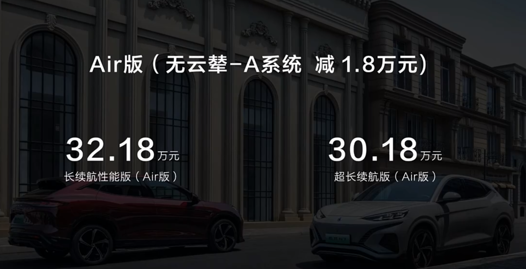 Air 版里没有 air ( 空气悬架 ),和理想学的是吧。。。并且有意思的是,本来 N7 标准版最低配 31.98 万的价格和理想最便宜的 L7 air 是一个价格,但在去掉空悬后, N7 就更便宜了。