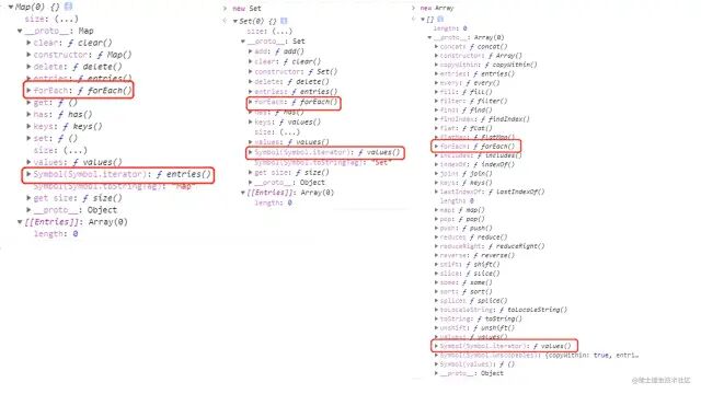 所以我们也能很直观的看到可迭代对象中的 Symbol.iterator 属性被调用时都能生成迭代器,而 forEach 也是生成一个迭代器,在内部的回调函数中传递出每个元素的值。(感兴趣的同学可以搜下 forEach 源码, Array Set Map 实例上都挂载着 forEach ,但网上的答案大多数是通过 length 判断长度, 利用for循环机制实现的。但在 Set Map 上使用会报错,所以我认为是调用的迭代器,不断调用 next,传参到回调函数。由于网上没查到答案也不妄下断言了,有答案的人可以评论区给我留言)