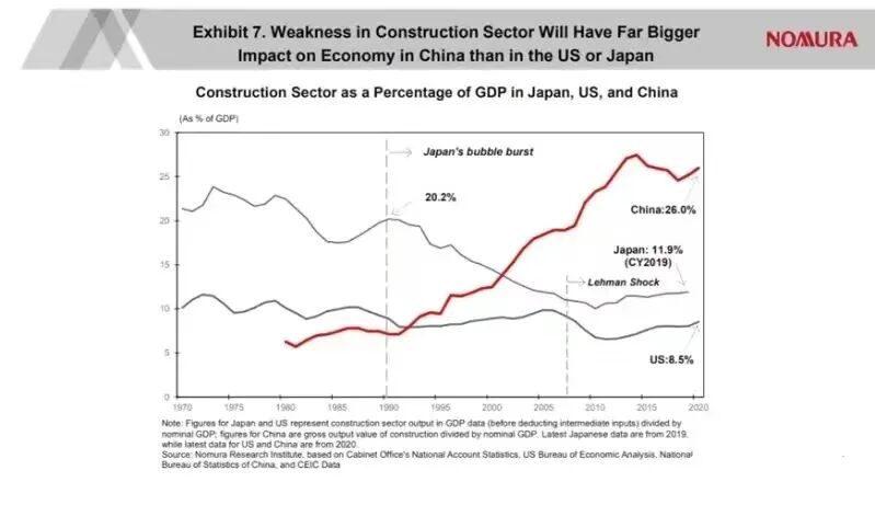 相比经历泡沫时期的日本,以及当今的日本和美国,中国建筑业的占比高达 26%。