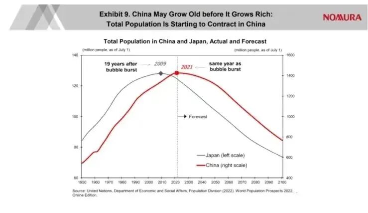 就中国而言,从同一年开始,泡沫破裂和人口问题都在朝着同一个方向发展。尽管人口统计是一个非常缓慢的过程,但这仍可能产生相当大的影响。