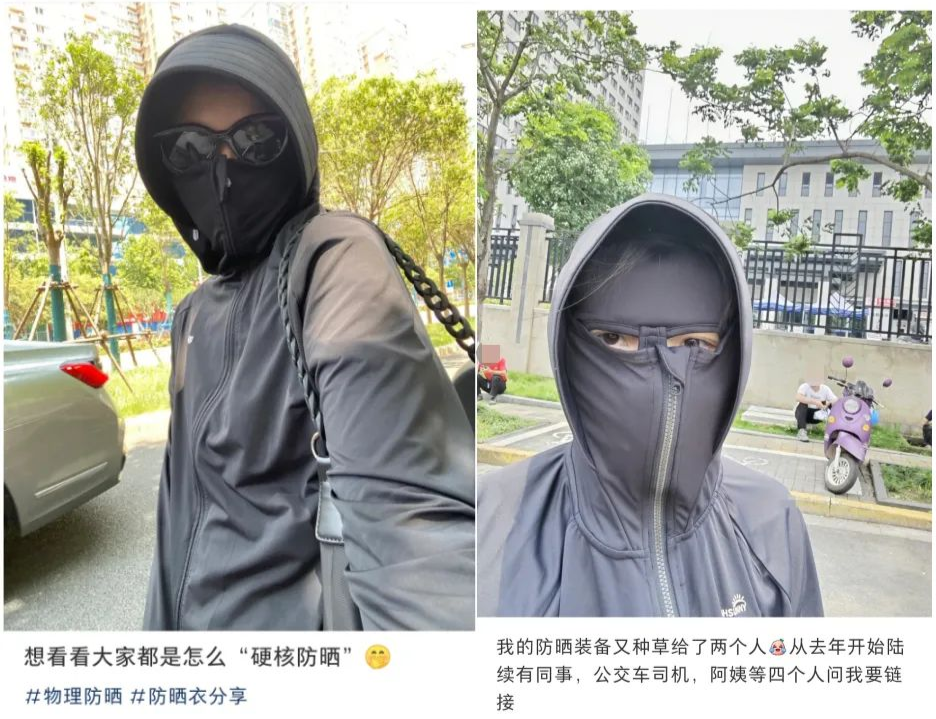 “现在我出门必须得戴墨镜、遮阳帽、穿防晒服,或者戴上冰袖,缺一不可。短裤短裙也不会穿了,腿必须盖严实,我可不想身上出现俩色号。”在北京骑车通勤的小钰(化名)说,现在物理防晒已成了她出门必备,大街上把自己“包成粽子”的人也比比皆是。
