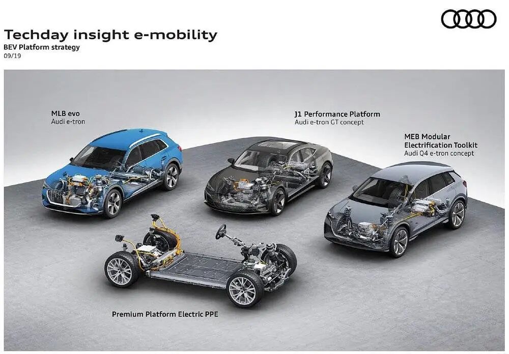 MLB evo 平台:根源上,这是个油车平台。兰博基尼、宾利、保时捷品牌的 SUV 车型和奥迪品牌的中大型车,都源于MLB evo 平台。该平台还诞生了一台饱受批评的“油改电”——奥迪 e-tron ;