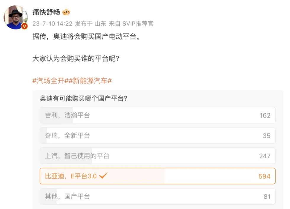 在微博上一场名为“奥迪最有可能会购买谁家平台”的投票中,比亚迪 e 平台 3.0 是群众呼声最高的选项,排名第二的是智己的上汽星云平台,第三是吉利浩瀚平台。