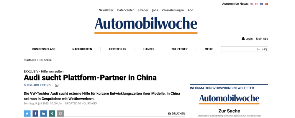 据德国媒体 Automobilwoche 报道,在纯电车领域始终无法找到突破口的奥迪正在努力寻求外部帮助,以缩短其车型开发时间并提升产品竞争力,其中被认为最有效的一个办法是:从它的中国竞争对手那里,购买一个现成的纯电平台,直接开造。