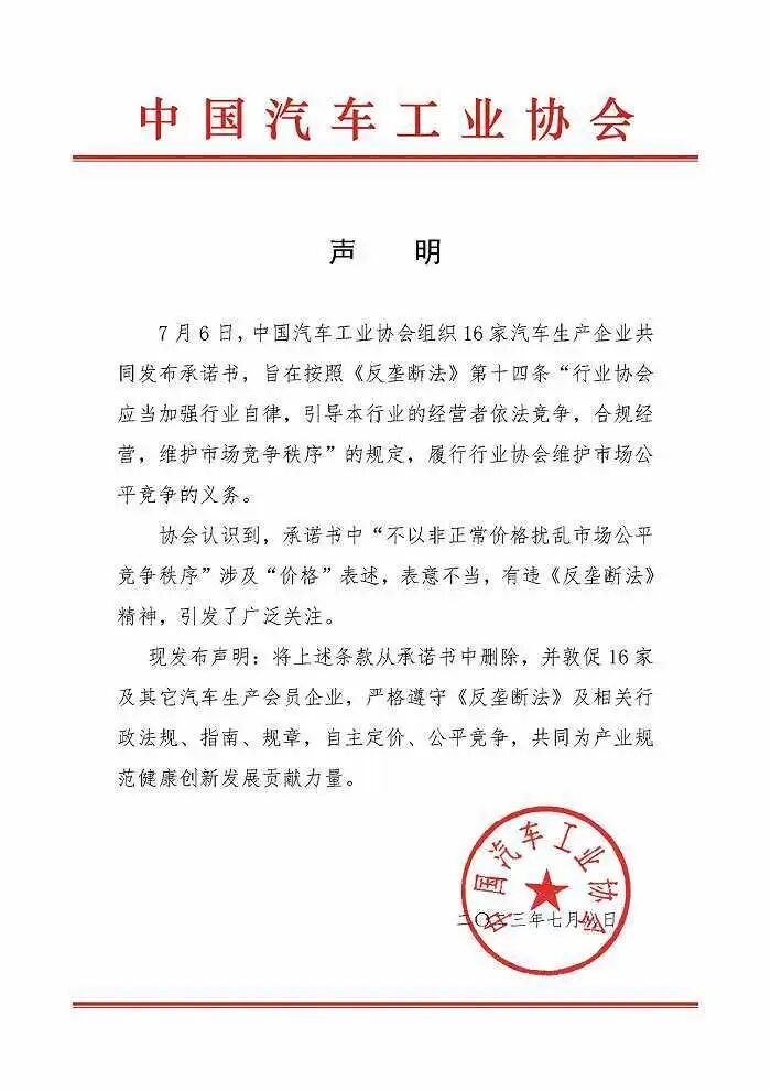 据界面,7月6日,中国汽车工业协会组织16家汽车生产企业签署了《汽车行业维护公平市场秩序承诺书》。7月8日,协会发布声明:协会认识到承诺书中“不以非正常价格扰乱市场公平竞争秩序”涉及“价格”表述,表意不当。将上述条款从承诺书中删除,并敦促16家及其它汽车生产会员企业,严格遵守《反垄断法》及相关行政法规、指南、规章,自主定价、公平竞争,共同为产业规范健康创新发展贡献力量。