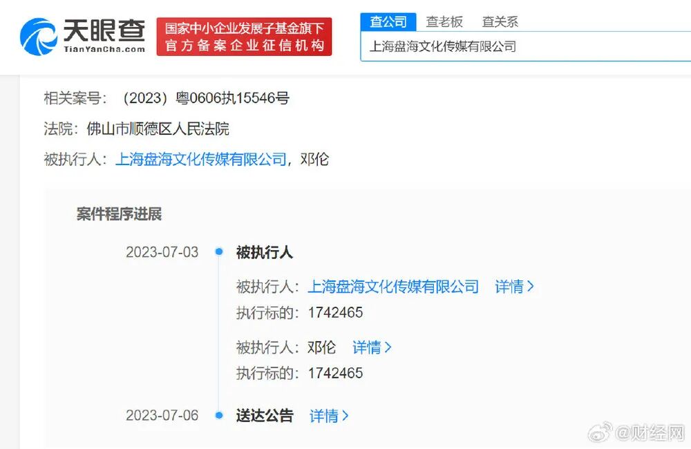 天眼查显示,近日,邓伦、上海盘海文化传媒有限公司新增一则被执行人信息,执行标的174万余元,执行法院为佛山市顺德区人民法院,申请执行人为佛山市云米电器科技有限公司,涉及服务合同纠纷案件。