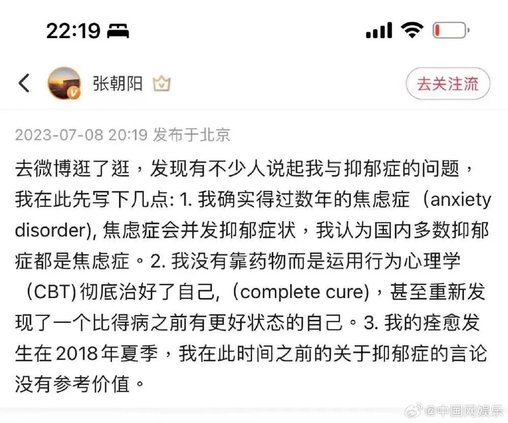 据中国网娱乐,近日,有关抑郁症的话题经常引发网友热议。搜狐张朝阳也一直被传患抑郁症多年。7月8日晚,张朝阳在社交平台发文回应,称自己此前得抑郁症,但在2018年已经彻底治愈。自己没有靠药物治疗,而是运用心理学(CBT)彻底治愈了自己,甚至重新发现了一个比自己得病之前更好的状态!