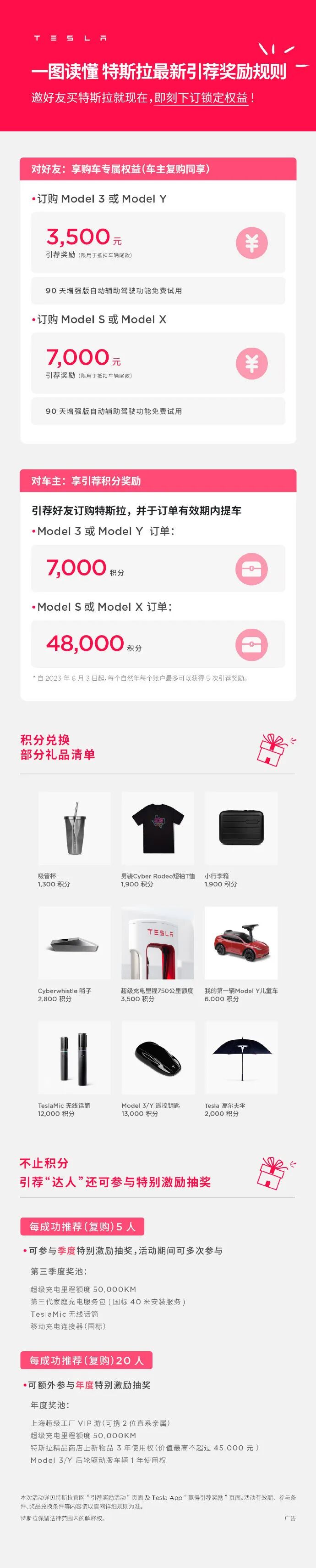 据财联社,特斯拉官微公布最新引荐购车奖励规则,引荐好友购买特斯拉Model 3/Y或Model S/X,购车人可分别获得3500元或7000元引荐奖励用于抵扣车辆尾款(车主复购同享),同时还可获得90天增强版自动辅助驾驶功能免费试用权;引荐人可获得积分奖励用于兑换超充额度等。此外,每成功推荐(复购)5人或20人,还可参与季度或年度特别激励抽奖,其中,年度奖池内含Model 3/Y后轮驱动版车辆1年使用权等。