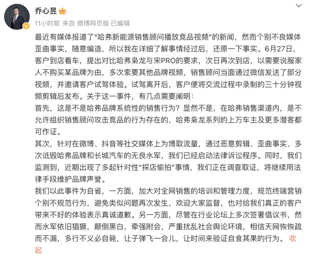 谈及事件经过,乔心昱称,“6月27日,客户到店看车,提出对比哈弗枭龙与宋PRO的要求,次日再次到店,以需要说服家人不购买某品牌为由,多次索要其他品牌视频,销售顾问当面通过微信发送了部分视频,并邀请客户试驾体验。试驾离开后,客户便将交流过程中录制的三十分钟视频剪辑后发布。”
