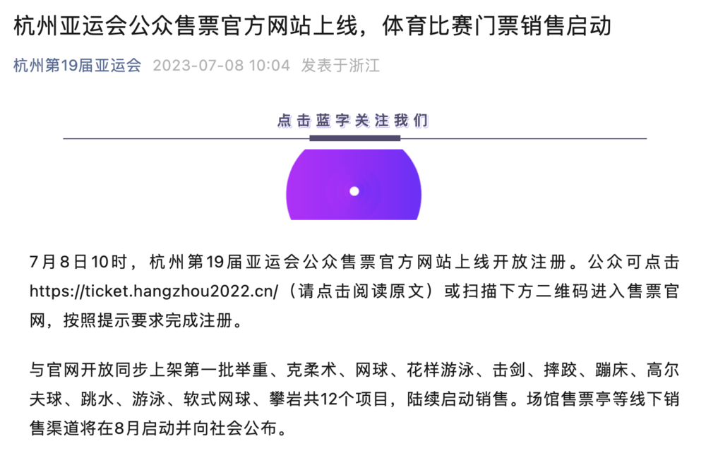 据杭州第19届亚运会,7月8日10时,杭州第19届亚运会公众售票官方网站上线开放注册。与官网开放同步上架第一批举重、克柔术、网球、花样游泳、击剑、摔跤、蹦床、高尔夫球、跳水、游泳、软式网球、攀岩共12个项目,陆续启动销售。场馆售票亭等线下销售渠道将在8月启动并向社会公布。
