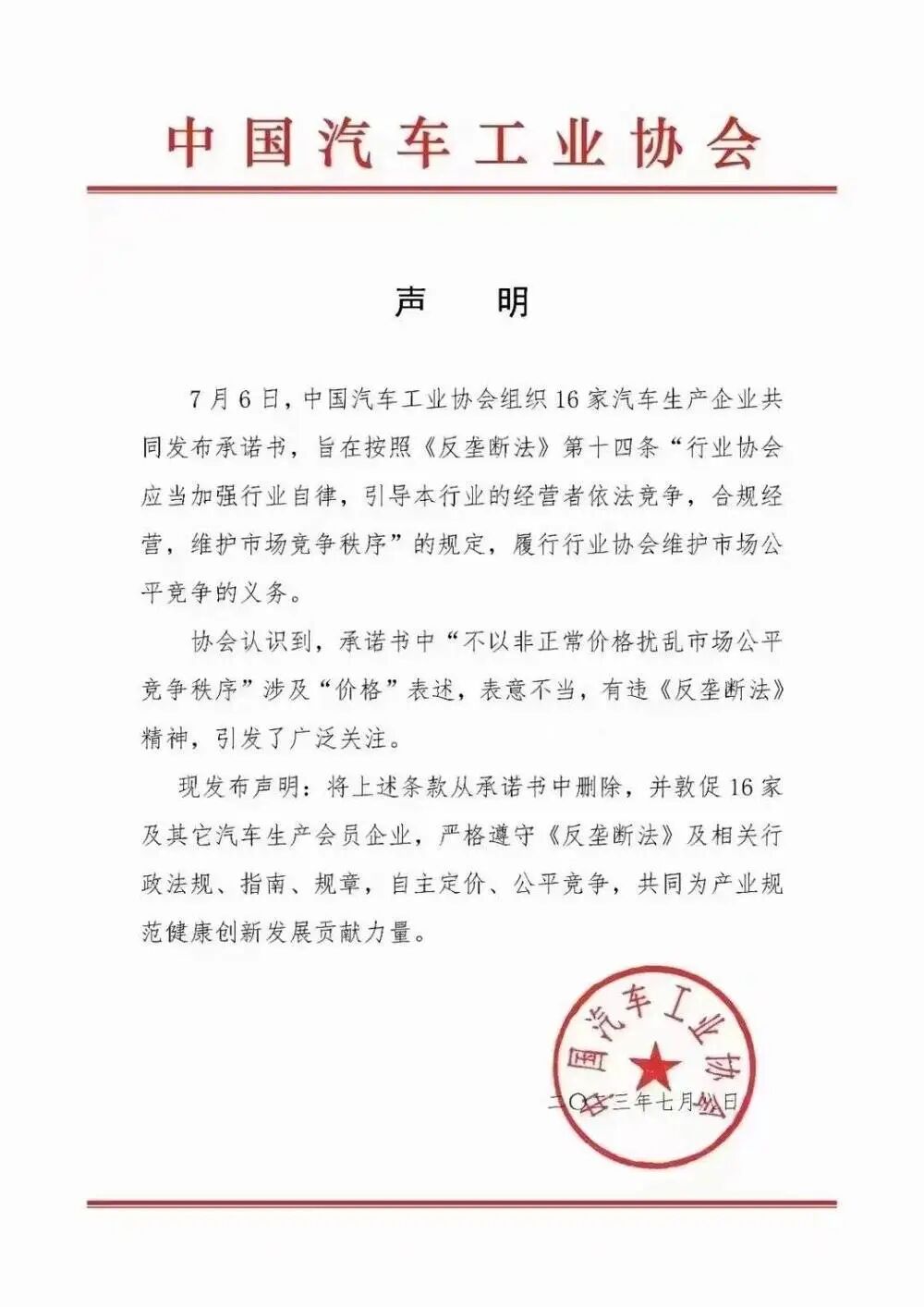 对此,中国汽车论坛的主办方——中国汽车工业协会显然也意识到了不对劲。在承诺书签署的两天后,该协会发布了声明,称其也察觉到了原文对于“价格”的阐述表意不当,有违《反垄断法》的精神,因此将该条款删除。