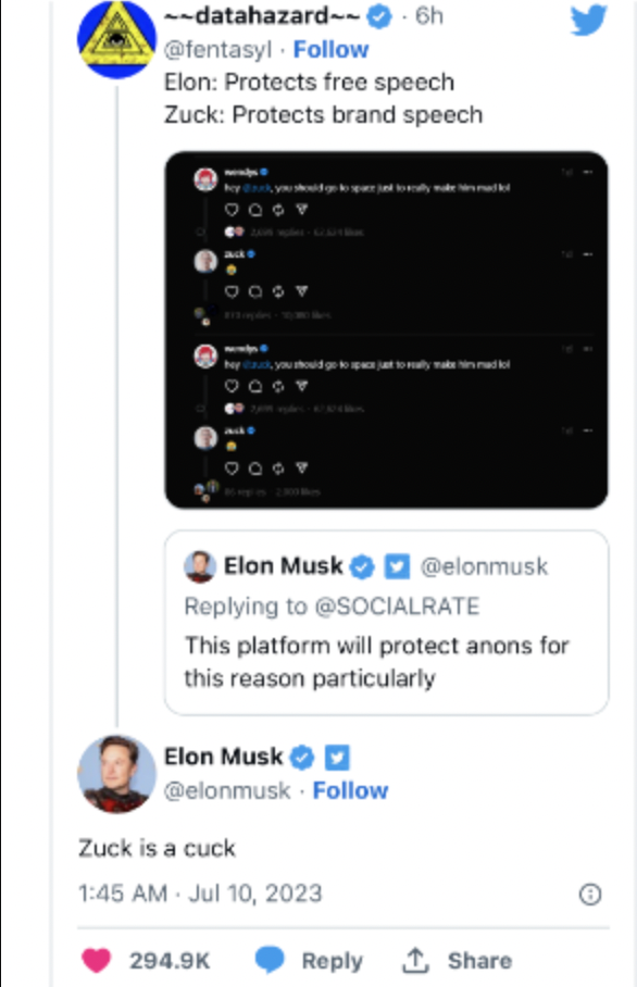 4天,Threads注册用户破亿。这个速度超过了ChatGPT,后者用了2个月的时间。The Verge、Tech Church等多家媒体报道了这一消息。最近几天,扎克伯格频繁在这个新平台上公布里程碑:头4个小时,注册用户500万;7小时,1000万;24小时内,3000万;48小时内,7000万。马斯克入主推特已经9个月,不管是这家公司的人员构成,还是这个产品的功能,都一直处在动荡当中。对于很多用户来说,10天前突如其来的“限流令”,成了“压死”他们的最后一根稻草,推特的替代品频频登上推特的热榜。Threads就是在这样的时机推出的,并迅速成为推特真真切切的威胁。虽然在Threads推出后,马斯克几乎没有做出评价。但是推特的慌张似乎已经显露出一角:马斯克的律师向扎克伯格发出了一封停止函,威胁要起诉Meta“系统性、故意和非法地盗用”推特的商业秘密和知识产权,以及窃取推特的数据。这封信函当中提到,Meta过去一年雇佣了几十位推特的前员工,他们手中掌握推特的商业机密:“Meta的模仿品(Copycat)Threads应用程序意图利用推特的商业机密和其他商业资产来加速Meta竞争应用程序的开发。”马斯克还在推特上不客气地开麦:“扎克就是个懦夫/软蛋。”这是对一位网友的回应,该网友称推特维护内容自由,而Threads维护品牌自由。在扎克伯格近20年的创业史上,以或买,或模仿(有些人坚持是抄袭)竞争对手的方式,不断扩大自己的社交帝国,是他的拿手好戏。扎克伯格和马斯克的“笼中斗”或将持续,但是眼下,不得不承认,扎克伯格好像已经赢下了第一回合。