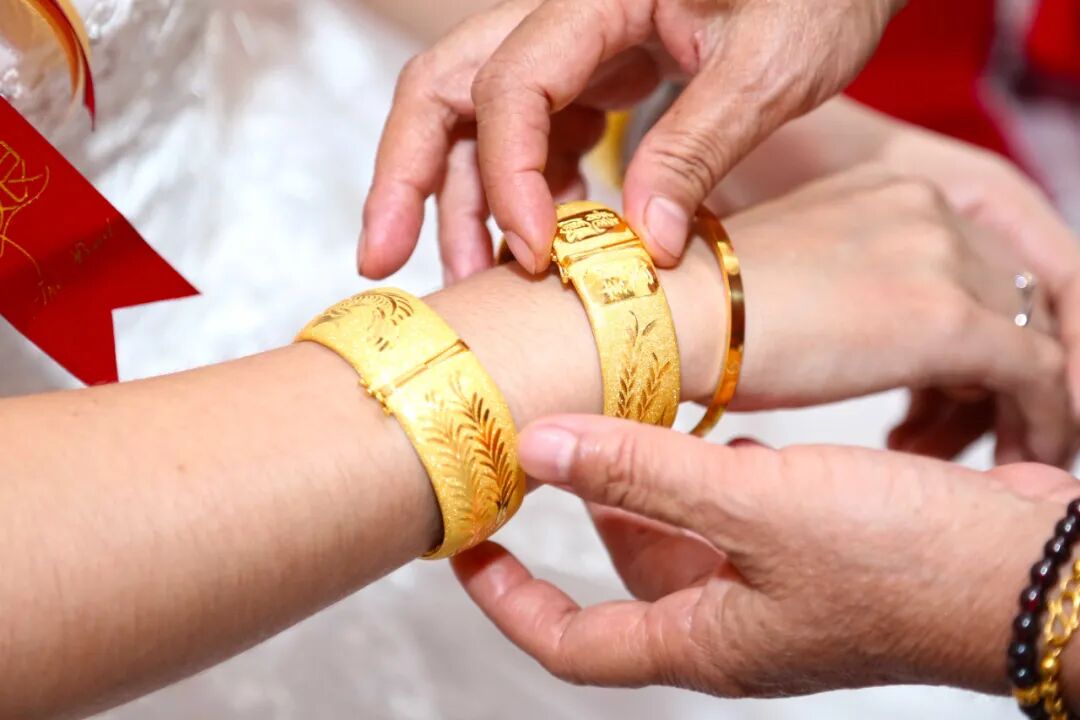 小县城娶媳妇要三金:金项链、金戒指、金耳环,一些地方还要五金甚至六金,除了项链、戒指、耳环,还有吊坠、头饰、和手镯。