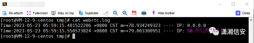 反向代理开启后会在当前目录下生成两个日志文件,access为访问日志,另一个为webrtc日志,找到的真实IP就会写入在这个文件中,如下图所示。